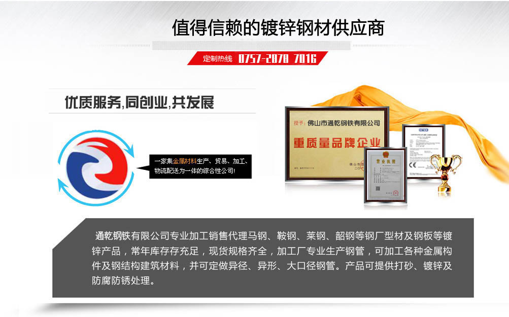 本公司專業(yè)加工銷售代理馬鋼、鞍鋼、萊鋼、韶鋼等鋼廠型材及鋼板等鍍鋅產(chǎn)品,常年庫存充足,現(xiàn)貨規(guī)格齊全,加工廠專業(yè)生產(chǎn)鋼管,可加工各種金屬構(gòu)件及鋼結(jié)構(gòu)建筑材料,并可定做異徑、異形、大口徑鋼管。產(chǎn)品可提供打砂、鍍鋅及防腐防銹處理。本公司規(guī)格材質(zhì)齊全,產(chǎn)品應(yīng)用領(lǐng)域廣泛,主要用于大棚建設(shè)、鋼結(jié)構(gòu)工程建筑,機(jī)械制造,幕墻門窗裝飾,汽車制造,家電制造,集裝箱制造,船舶,護(hù)欄,紡織等行業(yè)領(lǐng)域,為客戶提供了全方位產(chǎn)品供應(yīng)服務(wù)。貼近用戶,并以快速度、全方位、多渠道、近距離,為廣大用戶提供段質(zhì)、高效、便捷的鋼鐵,訊息資源服務(wù)。